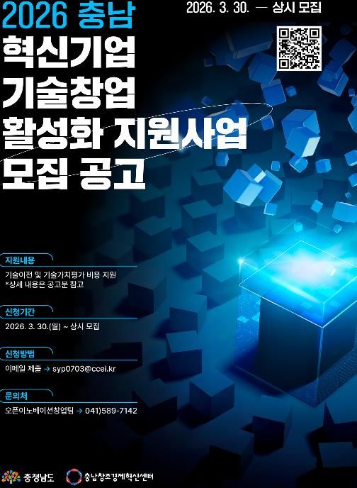 한방통신사 신유철기자 기자 | 충남창조경제혁신센터가 지역 창업기업의 기술 경쟁력을 높이고 성공적인 사업화를 돕기 위해 ‘2026년 충남 혁신기업 기술창업 활성화 지원사업’을 시행하고 참여 기업을 모집한다고 밝혔다.
