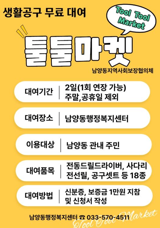 ‘툴툴마켓’은 자주 사용하지 않는 공구를 무료로 대여해 남양동 주민들의 생활 편의를 높이고, 불필요한 구매를 줄여 가계 부담을 덜어주기 위하여 사회복지공동모금회 지정기탁 후원금을 배분받아 운영된다.