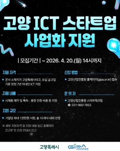 한방통신사 신유철기자 기자 | 고양산업진흥원이 ‘2026년 고양 ICT 스타트업 사업화 지원사업’ 참여 기업을 모집한다.