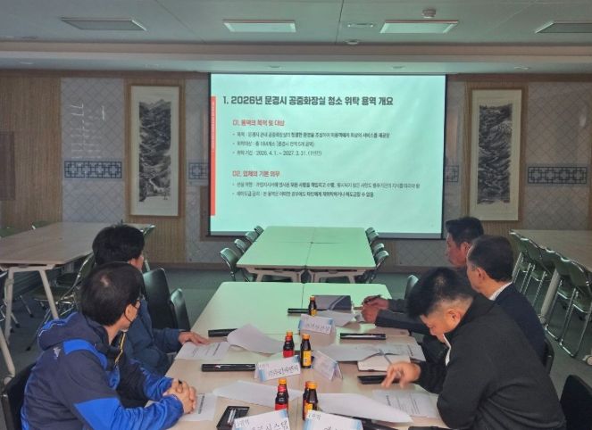 이번 교육은 2026년 4월 1일부터 2027년 3월 31일까지 1년간 진행되는 공중화장실 청소 위탁사업의 원활한 수행을 위해 마련됐으며, 문경시 전역 5개 권역을 관리하는 위탁업체 관계자들이 참석했다.