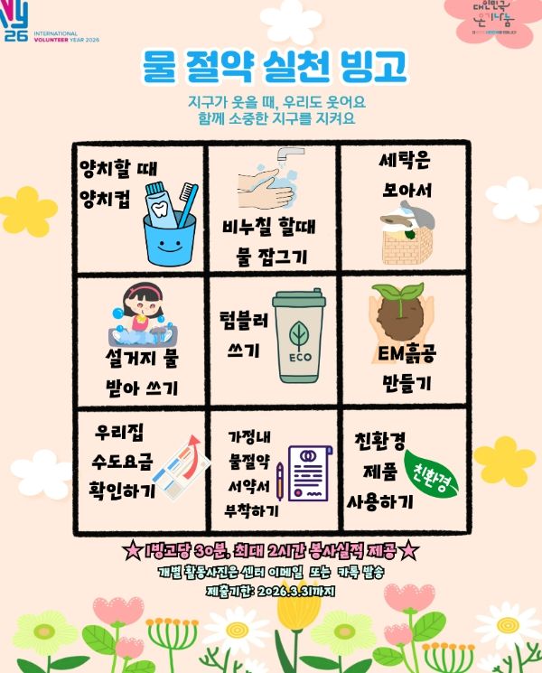 한방통신사 신유철기자 기자 | 강화군자원봉사센터가 2026년 한마음 가족봉사단의 1차 활동으로 재택 자원봉사 프로그램인 '물 절약 실천 빙고'를 운영했다고 밝혔다.
