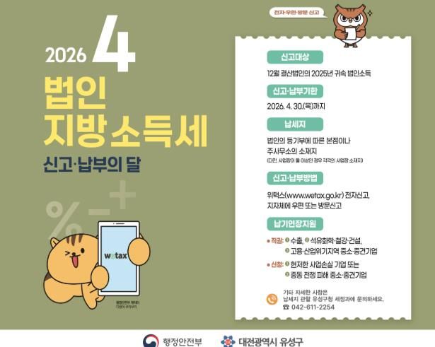 한방통신사 신태공 기자 | 대전 유성구는 오는 30일까지 2025년 귀속 법인지방소득세 신고납부 기간을 운영한다.