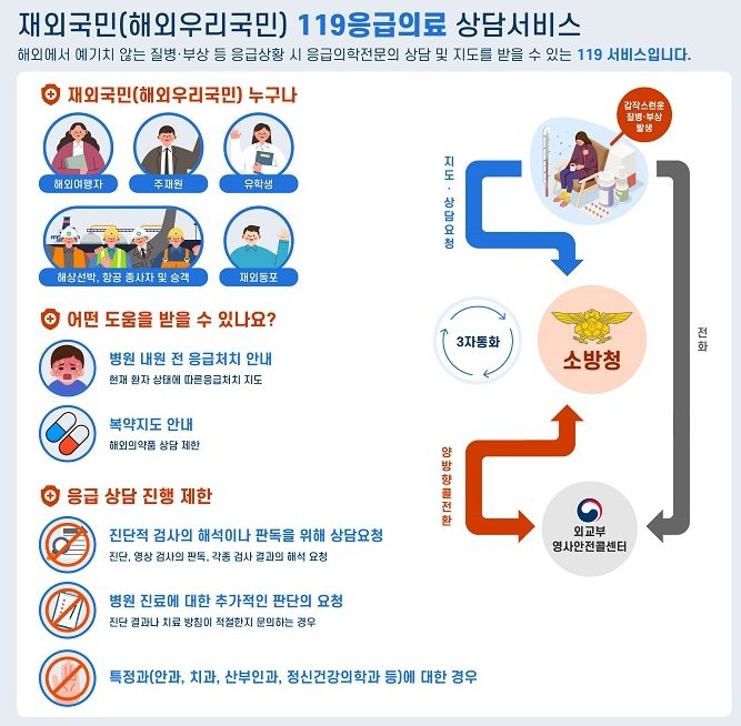 또한, 해외에 체류 중인 재외국민들을 대상으로 ‘응급의료상담서비스’를 운영 중이며, 이 서비스는 재외국민, 해외 여행객 등에게 갑작스러운 질병이나 부상시 전화, 이메일, 인터넷, 카카오플러스 신고를 통해 의료상담을 받을 수 있다.