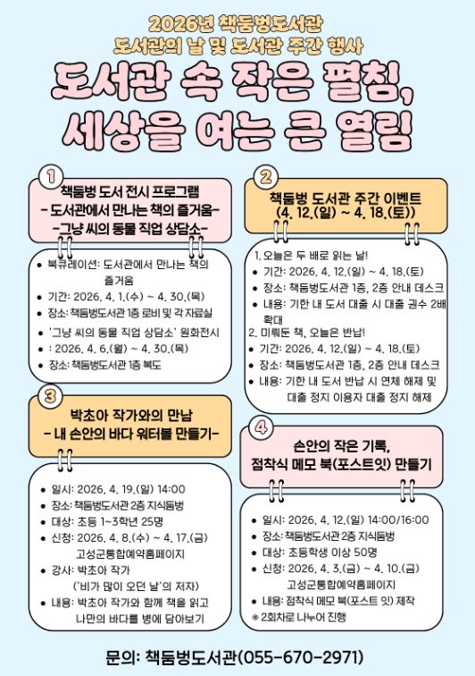 도서관 주간은 매년 4월 도서관의 가치와 역할을 널리 알리고 독서 문화 확산을 위해 추진되는 행사로, 책둠벙도서관은 누구나 부담 없이 도서관을 찾고 책과 가까워질 수 있도록 다양한 프로그램을 마련했다.