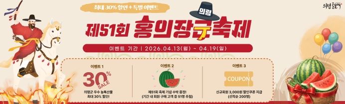 한방통신사 신유철기자 기자 | 의령군은 제51회 홍의장군축제를 맞아 오는 13일부터 19일까지 7일간 공식 온라인 쇼핑몰 ‘토요애’에서 특별이벤트를 진행한다.