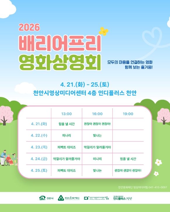 한방통신사 신태공 기자 | 천안문화재단은 이달 21~ 25일 천안시영상미디어센터에서 ‘배리어프리 영화상영회’를 운영한다고 14일 밝혔다.
