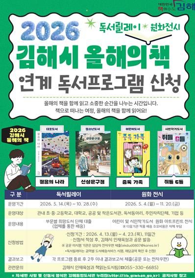 한방통신사 신유철기자 기자 | 김해시는 ‘2026 김해시 올해의 책’ 독서릴레이와 독후활동에 참여할 기관 및 단체를 13일부터 모집 중이라고 밝혔다.