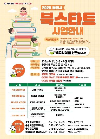 통영시에 주소를 둔 도서관 회원을 대상으로 연령별 5단계(베이비, 플러스, 보물상자, 책날개, 시니어) 맞춤형 그림책과 독서 가이드북 등이 담긴 꾸러미를 소진 시까지 선착순으로 배부한다.