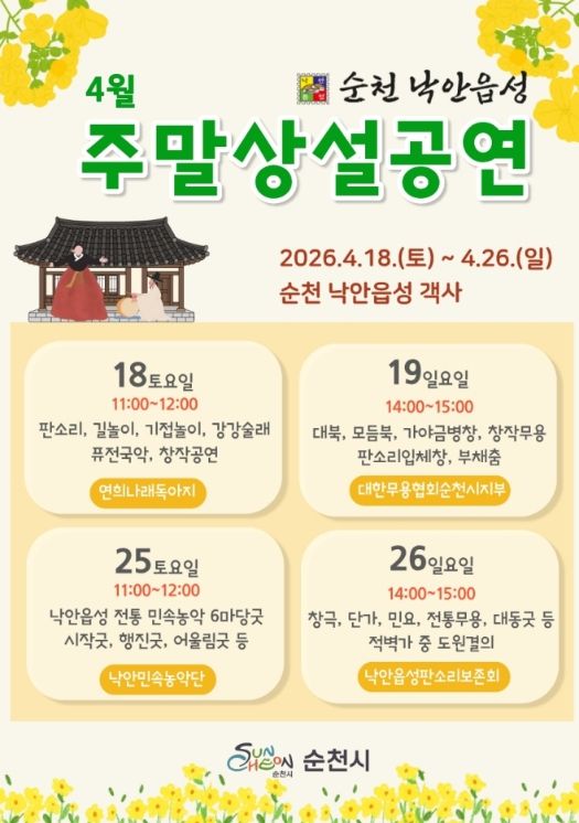 한방통신사 신다은기자 기자 | 순천시는 오는 18일부터 주말과 공휴일에 순천 낙안읍성 객사에서 다채로운 주말상설공연을 개최한다고 밝혔다.