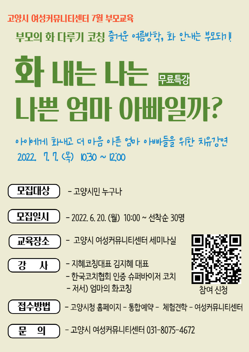 고양시 여성커뮤니티센터에서 여름방학을 맞이해 ‘즐거운 여름방학, 화 안내는 부모 되기 ’특강을 진행한다.