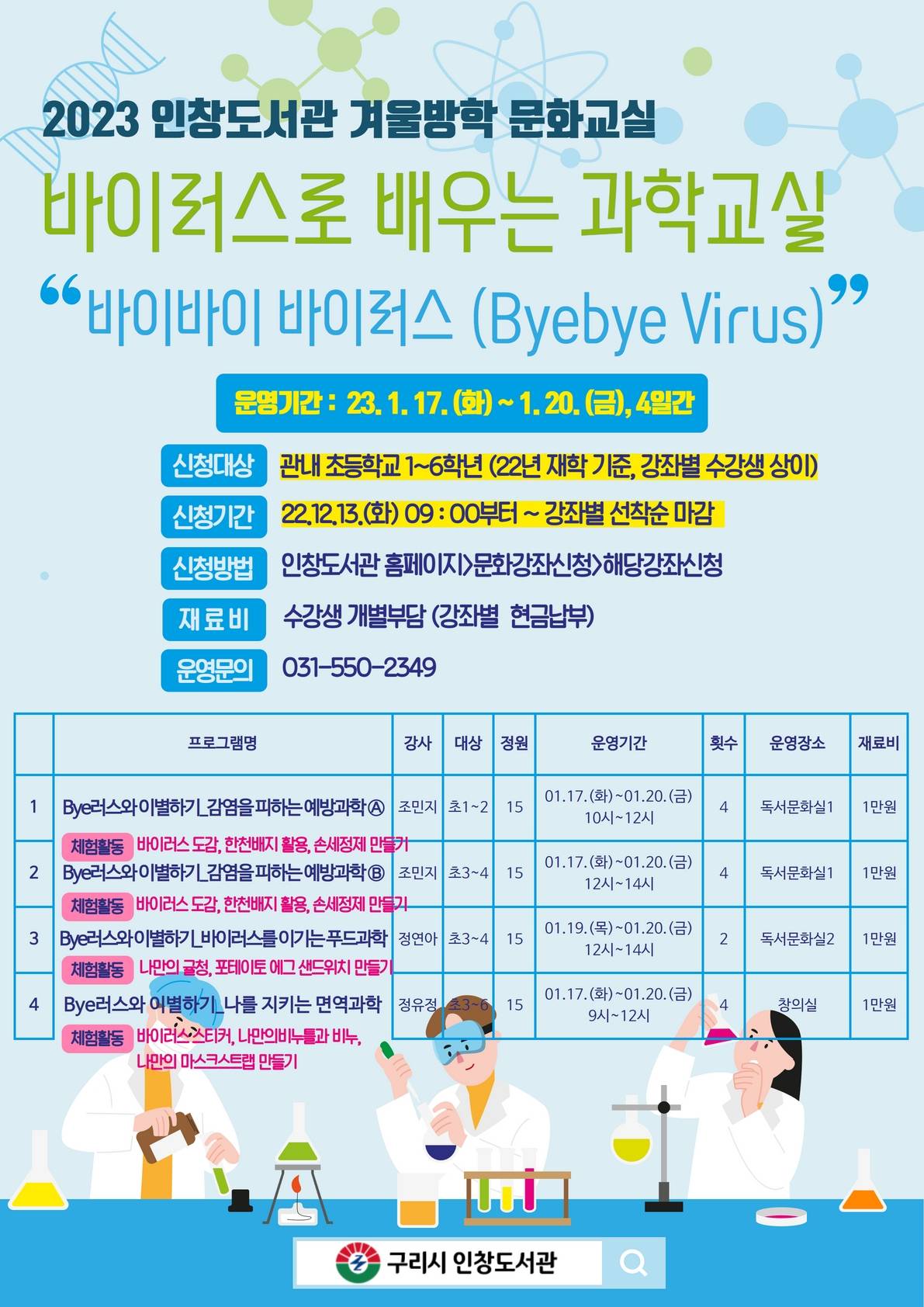□ 겨울방학 문화교실은 「바이러스로 배우는 과학교실 : 바이바이 바이러스 (Bye bye Virus)」라는 주제로 오는 2023년 1월 17일(화)부터 20일(금)까지 4일간 운영된다.