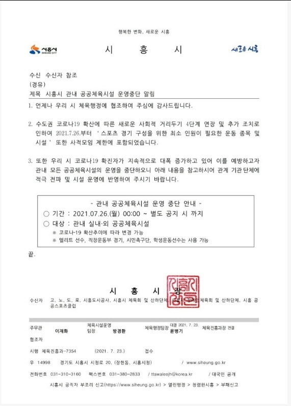 지난 18일 청룡 유나이티드, 초 중 축구학생선수단(회장 임현택)에 따르면 7월 28일 시흥시 체육진흥과를 찾아 학생선수의 포동 운동장 사용을 할 수 있도록 해 달라는 요구를 했으나 시는 코로나19 등의 이유를 들어 이를 불허한 것으로 알려졌다.하지만 시는 운동장 사용과 관련하여 7월 23일 ‘엘리트 선수, 직장운동부 경기, 학생운동선수는 사용 가능’ 이라는 공문(사진참조)을 시흥도시공사와 시흥체육회 및 산하단체, 시흥시 공공스포츠클럽 등 운동장을 관리하는 기관에 보냈다.