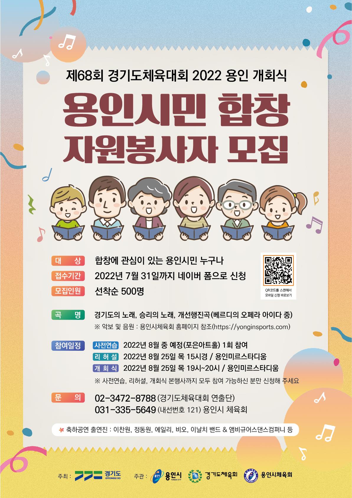 용인시가 ‘제68회 경기도체육대회 2022용인’ 개회식에서 경기도내 31개 시·군 합창단과 함께 노래할 용인시민 합창 자원봉사자를 29일부터 공개 모집한다.