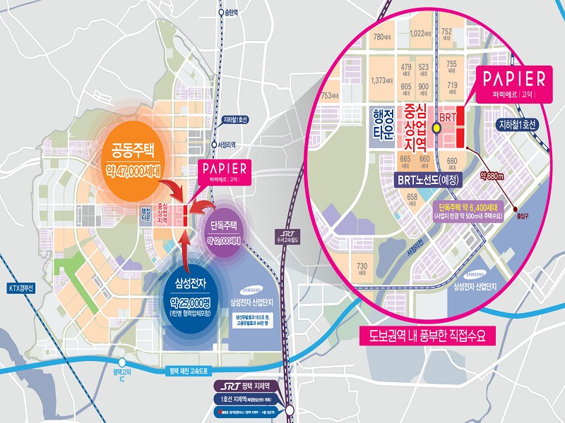 반도건설 브랜드 상가 ‘파피에르 고덕’은 고덕국제신도시 중심부인 비즈니스콤플렉스타운에 들어선다. 수도권 1호선 서정리역과 SRT·KTX(예정)·수도권 1호선이 정차하는 지제역과 가깝고, 고덕국제신도시를 순환하는 BRT(간선급행버스체계) 정류장도 인근에 위치해 고덕신도시 주요지역에서의 고객 유입도 기대된다.
