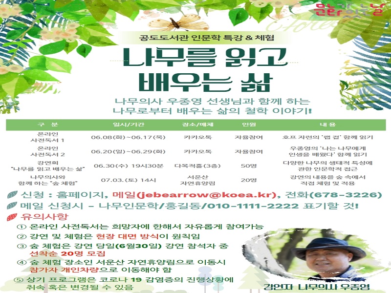안성시 공도도서관은 오는 8일부터 7월 3일까지 인문학 프로그램 ‘나무를 읽고 배우는 삶’을 운영한다고 밝혔다.