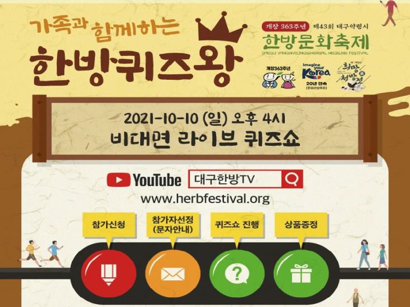 대한민국 대표 한방문화축제인 ‘대구약령시한방문화축제’가 10월 6일(수)부터 10월 10일(일)까지 온택트로 펼쳐진다. 대구시와 대구시 중구가 주최하고 (사)약령시보존위원회가 주관하는 이번 축제는 당초 온라인과 오프라인으로 병행해 준비해왔으나 코로나19 상황을 고려해 온라인으로만 개최하게 됐다.