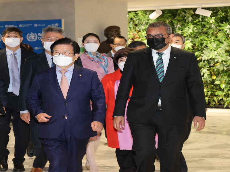 스위스를 공식 방문 중인 박병석 국회의장이 23일(현지시간) 오후 스위스 제네바에 있는 세계보건기구(WHO) 본부에서 테드로스 아드하놈 게브레예수스 사무총장과 만나 WHO가 추진 중인 ‘글로벌 바이오인력 양성허브’ 국가로 한국이 최적임을 강조했다. 박 의장은 또 대조 백신 확보와 대북 인도적 지원을 위한 WHO의 협력을 당부했다.