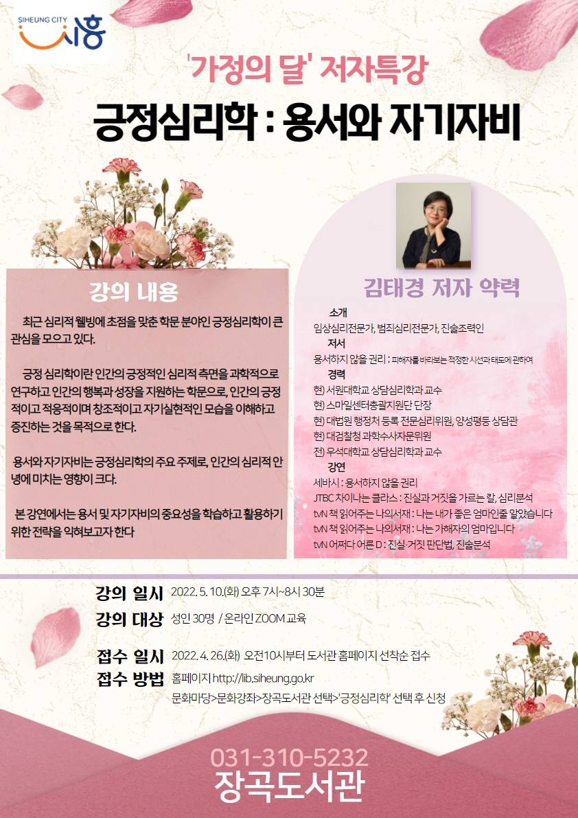 강좌 참여를 위한 신청은 4월 26일 오전 10시부터 시흥시중앙도서관 홈페이지(http://lib.siheung.go.kr)에서 선착순으로 이뤄진다.