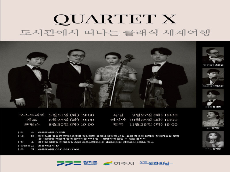 도서관 여강홀에서 대면으로 운영되는 「도서관에서 떠나는 클래식 세계여행」 시리즈 참여 신청은 공연일 일주일 전부터 여주시립도서관 홈페이지와 밴드에서 할 수 있다.