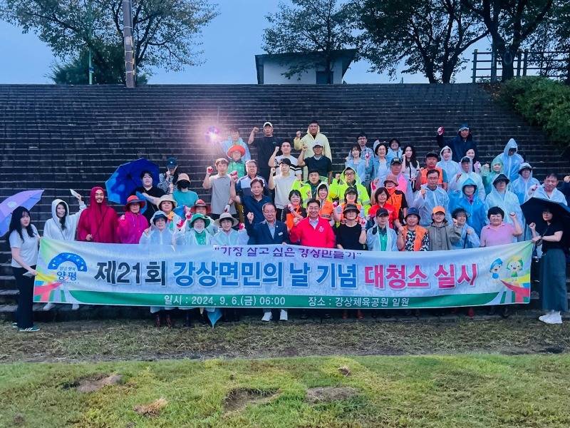 강상면민의 날에 체육대회와 문화행사를 함께 개최하는 것은 2018년 이후 6년 만으로, 오는 9월 7일 개최한다. 이에 따라 쾌적한 행사장 환경을 제공하기 위해 강상면 각 기관·단체 및 직원 등 100여 명은 이른 아침 한마음으로 대청소에 나섰다.
