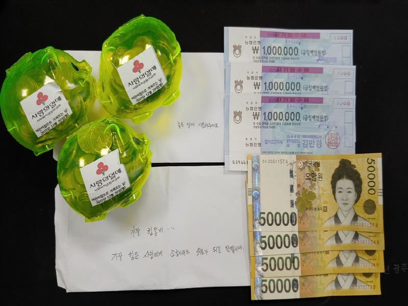 이에 앞서 지난달 29일에는 또 다른 익명의 독지가가 20만원을 기부했으며 31일에는 행복한 어린이집에서 아이들이 모은 저금통 3개를 들고 찾아와 이웃돕기에 동참했다.