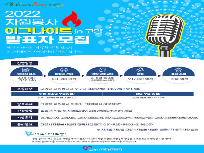 고양시자원봉사센터(이하 센터)에서는 오는 18일부터 다음 달 18일까지 「2022 자원봉사 이그나이트 in 고양」에 참가할 발표자를 모집한다고 밝혔다.