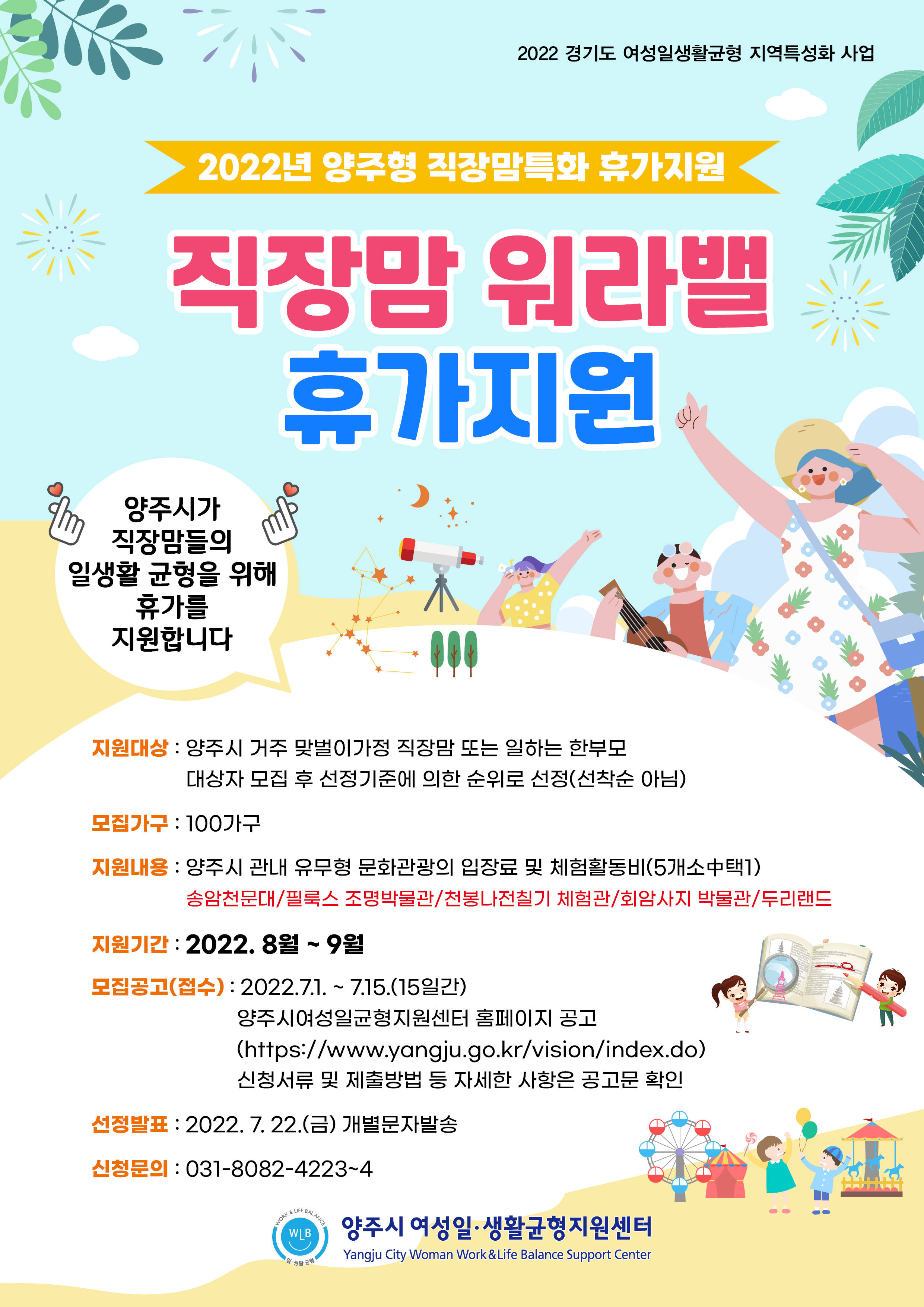 양주시여성일생활균형지원센터는 오는 15일까지 2022년 양주형직장맘 특화 휴가지원 사업인‘직장맘 워라밸 휴가지원’에 참여할 맞벌이 직장맘, 일하는 한부모 가정을 모집한다.‘직장맘 워라밸 휴가지원’은 신청자와 가족이 함께 즐길 수 있도록 관내 5개소의 문화관광시설 입장료와 체험비를 지원하고 지역경제 활성화를 도모하고자 우리시의 문화적 자산을 활용한 휴가 지원 사업이다.