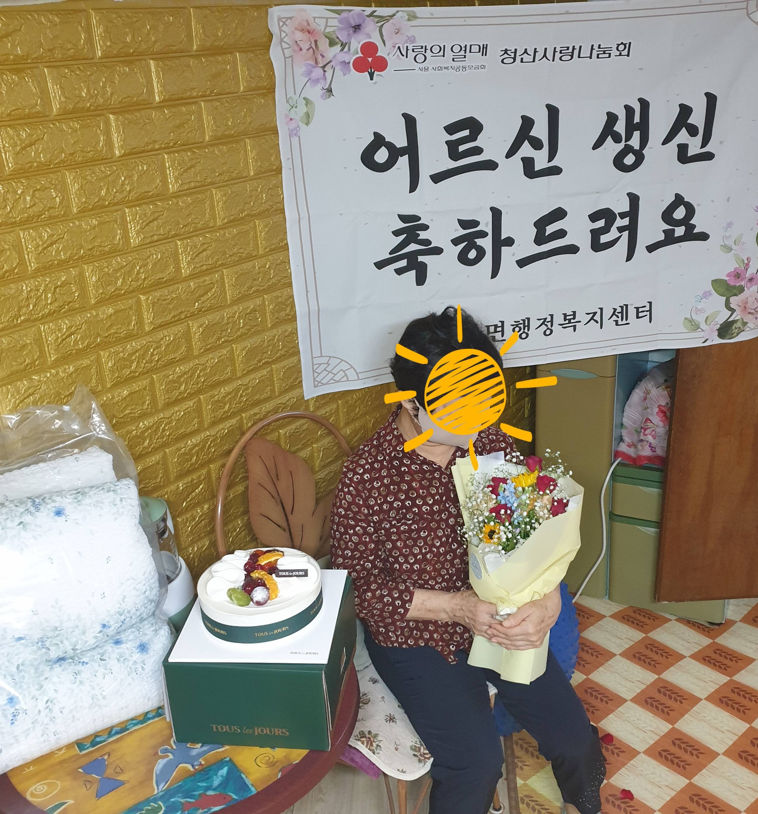 매월 초정기적으로 시행하고 있는 청산사랑나눔회의 생신축하서비스는 8월 현재 17명의 어르신이 생신축하DAY’ 사업의 지원을 받아 뜻깊은 하루를 선물 받았다.