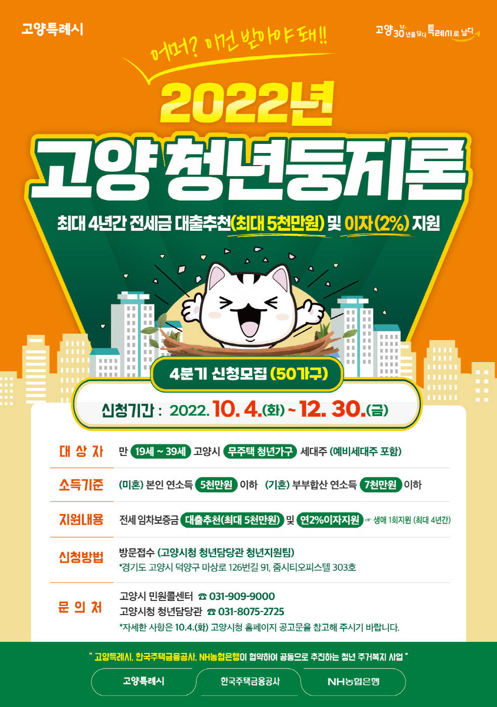 고양특례시(시장 이동환)가 10월 4일부터 ‘고양 청년둥지론’ 사업의 마지막 4분기 지원가구 50가구를 모집한다.고양 청년둥지론은 한국주택금융공사와 NH농협은행과 협약하여 무주택 청년가구(분기별 50가구/연 200가구)를 대상으로 최대 4년간 전세임차보증금 대출추천(최대 5천만 원) 및 연 대출이자 2%(최대 100만 원)를 지원하는 사업이다.