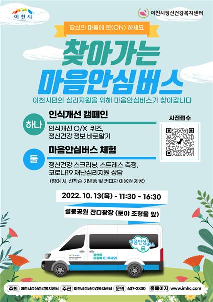 이천시보건소와 이천시정신건강복지센터는 ‘10월 10일 세계 정신건강의 날’을 맞이하여 10월 13일 11시부터 이천설봉공원에서 마음안심버스 운영 기념식 및 정신건강의 날 캠페인 ‘마음 온(ON)’을 진행한다.