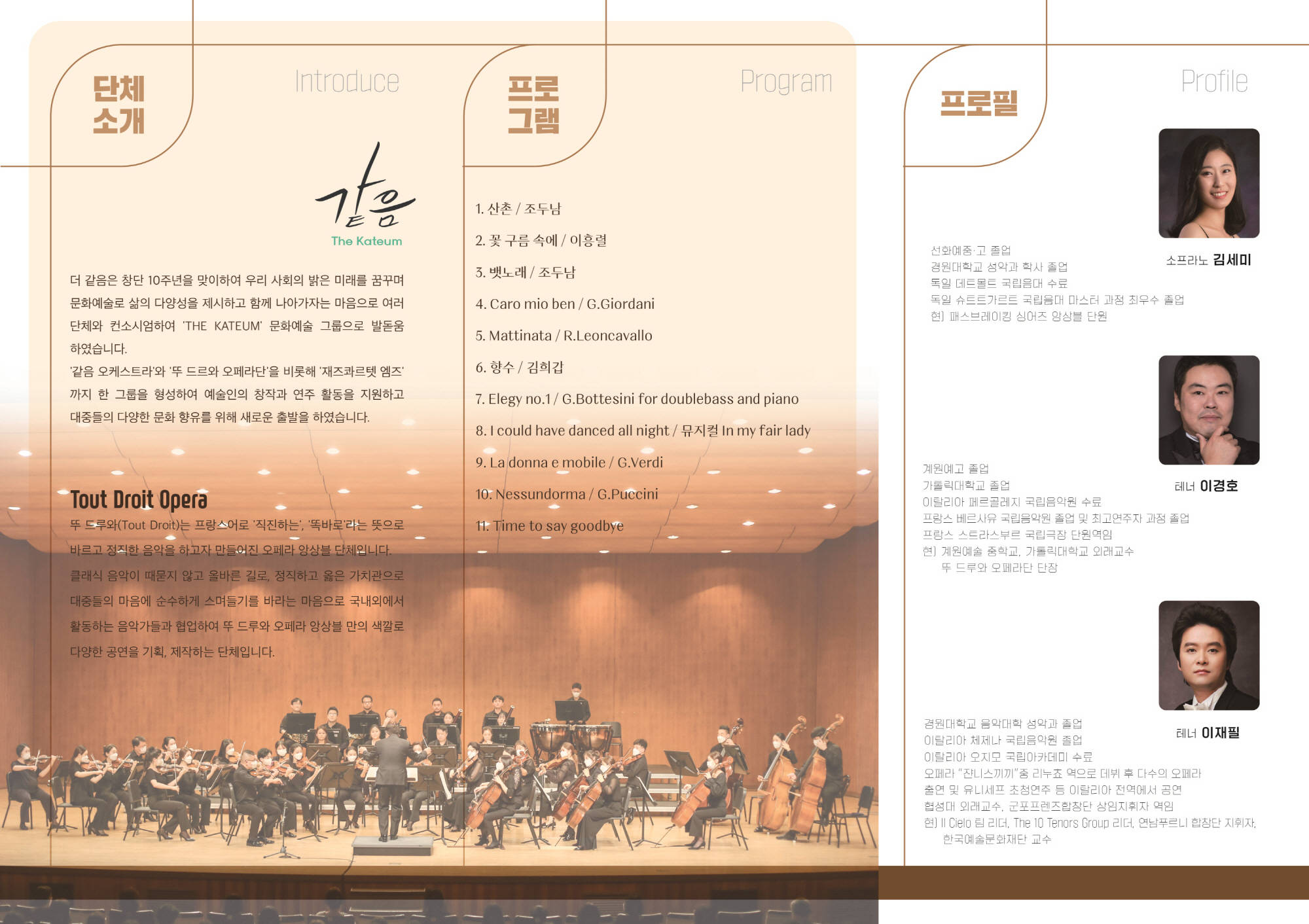 그리고, 현재는 여주시 미술관 「아트뮤지엄 려」와 함께 ‘클래식 들려주는 미술관’ 프로그램을 통해 다양한 형태의 연주회를 진행하고 있다. 그리고, 이번에는 ‘뚜 드르와 오페라단’ 클래식 3중창 공연이 진행된다.