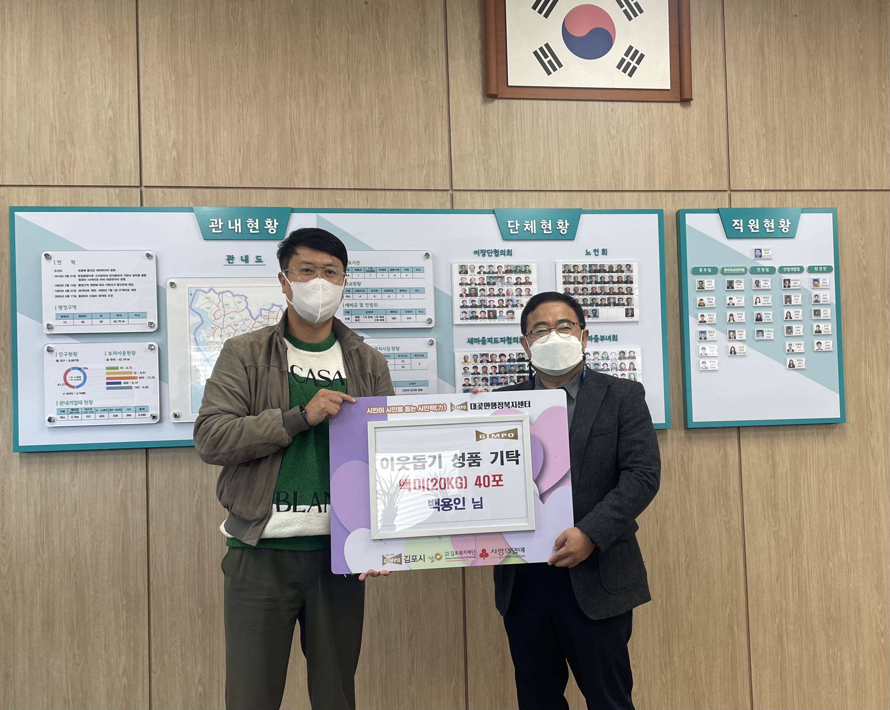 지난 15일 ㈜다원D&C(부대표 백용인)는 대곶면행정복지센터를 찾아 쌀 20KG 40포를 기탁했으며, 대곶면이장단협의회(회장 황재연)는 불우이웃 돕기 성금으로 200만원을 기탁했다.