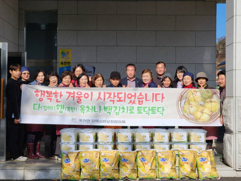 홍성복 옥천면장은 “추운 겨울 ‘백김치 토닥토닥’ 사업으로 옥천면은 행복한 겨울이 시작되었다.”며, “따뜻한 손길이 모여 정성으로 담근 백김치를 통해 훈훈한 온기가 모든 이웃들에게 전달되기를 바란다.”고 말했다.