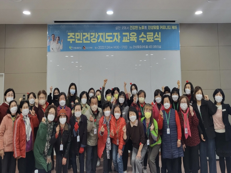 2022년 주민건강지도자 양성교육은 안성맞춤 커뮤니티 케어 사업 중 주민역량강화사업의 일환으로, 마을 문제에 관심이 많은 안성시 12개 마을 주민 37명을 대상으로 진행됐으며, 이들을 중심으로 다가오는 초고령 사회를 맞이해 주민 스스로 마을의 건강 문제를 파악하고 건강생활 실천 문화를 확산시키는 환경을 조성하고자 추진됐다.