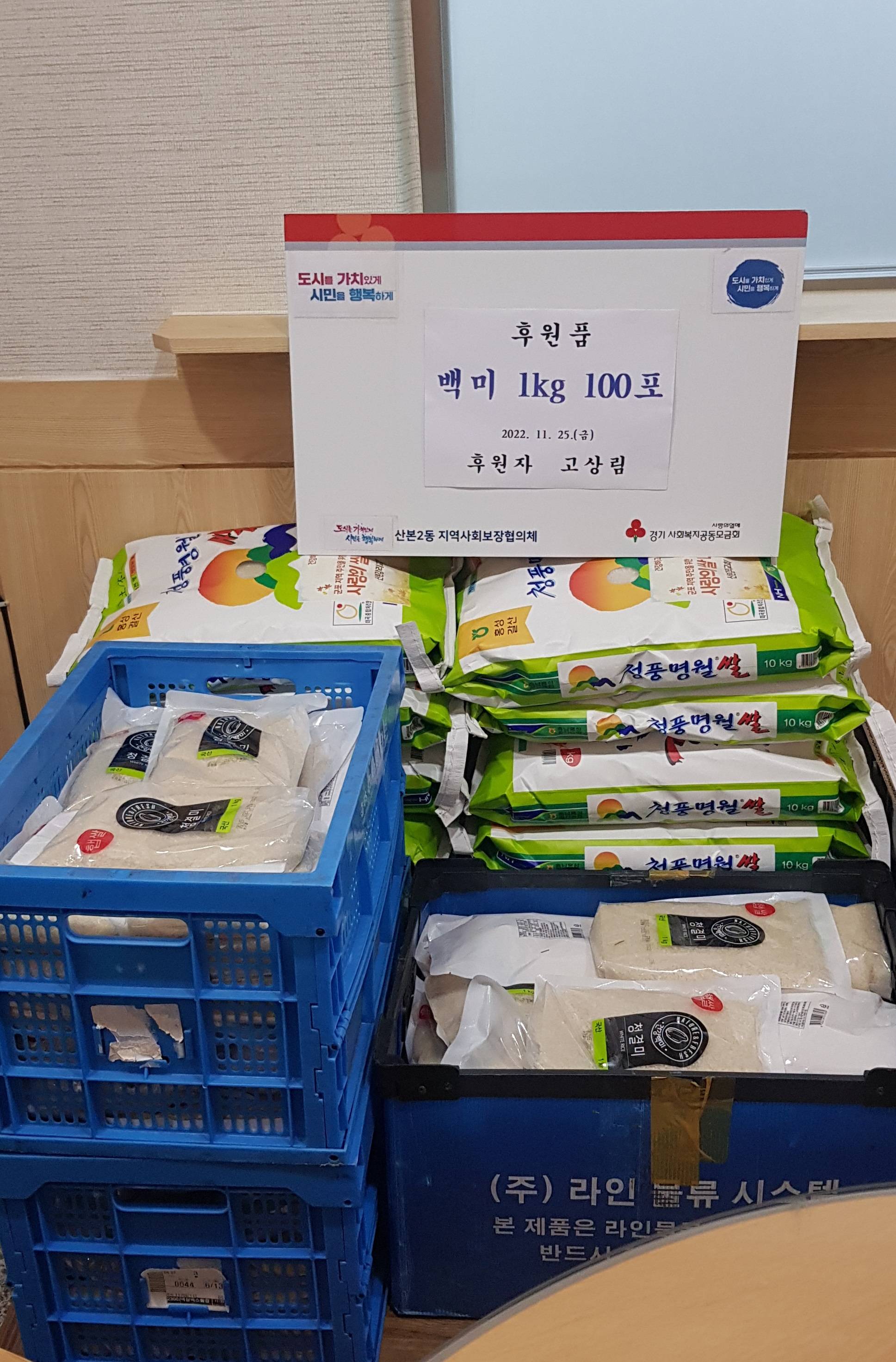 군포시 산본2동 지역사회보장협의체 고상림 부위원장이 11월 25일 이웃돕기 후원품으로 백미 100kg을 산본2동에 기탁했다.이날 후원으로 올해만 벌써 세 차례 백미 100kg을 기탁하여 총 300kg의 백미를 어려운 이웃에게 나눠줄 수 있게 된 것이다.
