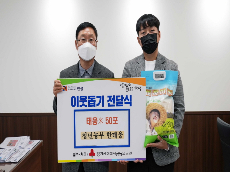 임병주 안성시 부시장은 “지난 1년 동안 직접 땀 흘리며 농사지은 쌀을 기부해주셔서 더욱 귀하고 가치가 있는 것 같다. 태웅 씨의 따뜻한 마음을 이웃들에게 잘 전달하겠다”며 고마움을 전했다.