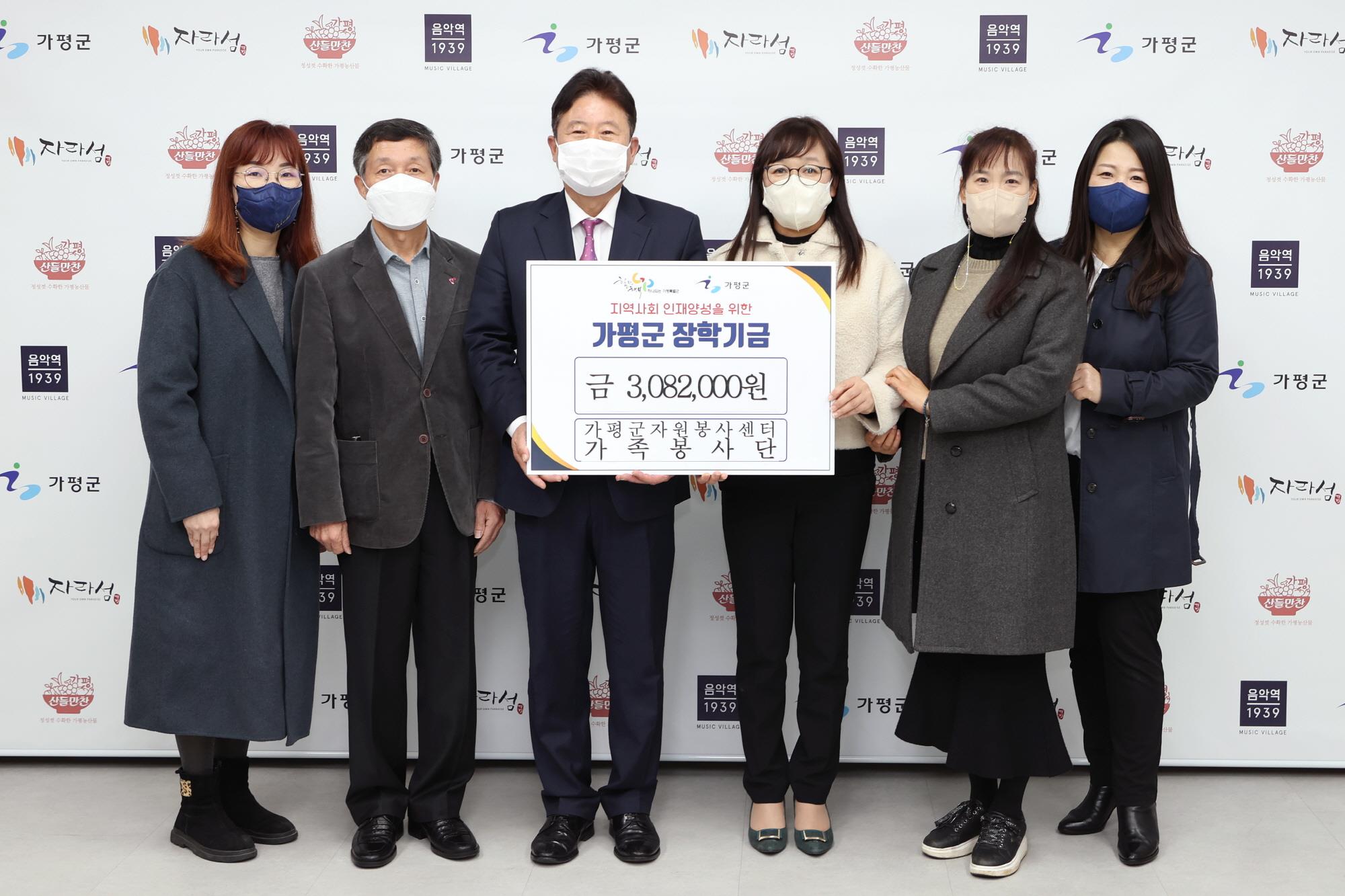 가족봉사단은 지난 2016년부터 꾸준히 가평군 이웃돕기성금과 장학기금을 기탁해 왔으며, 그 금액은 1800만원에 달한다.