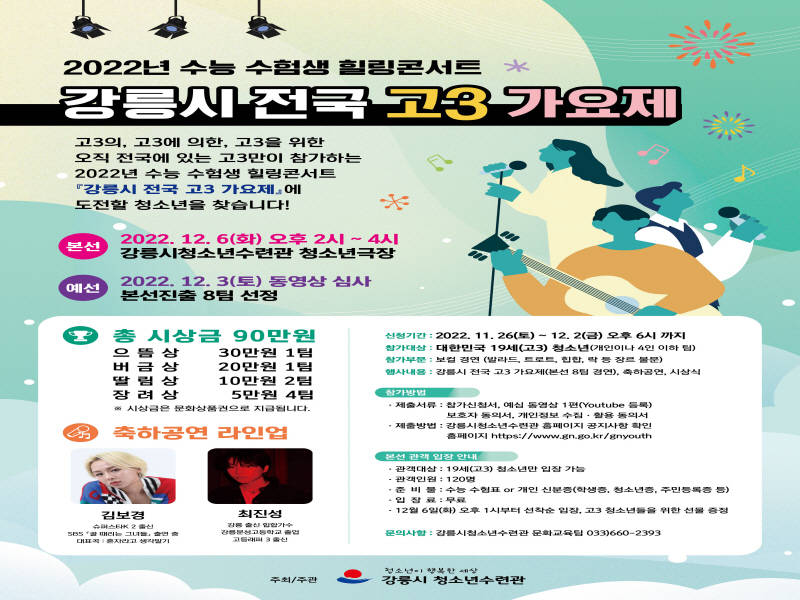 강릉시는 수능시험을 마친 고3 학생들을 위해 오는 6일(화) 청소년수련관 청소년극장에서 2022년 수능 수험생 힐링콘서트 「강릉시 전국 고3 가요제」를 개최한다.