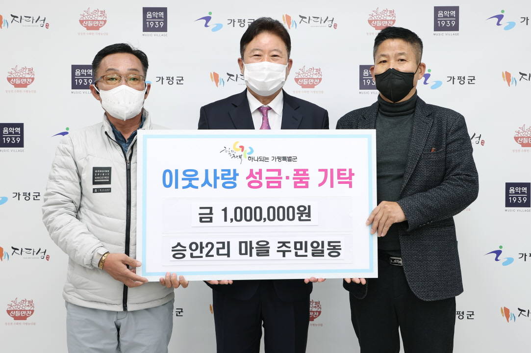 지난 12월 1일 ‘승안2리 마을 주민일동(이장 김용구)’은 연말연시를 맞아 관내 어려운 이웃을 위해 써달라며 군에 이웃돕기 성금 100만원을 기탁하여 전달식을 가졌다.