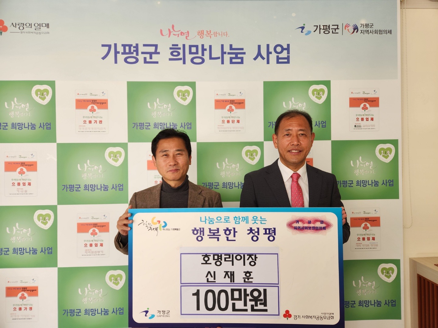 청평면은 12월 1일 호명리 이장 신재훈이 이웃돕기 현금 100만원을 기탁했다고 전했다.