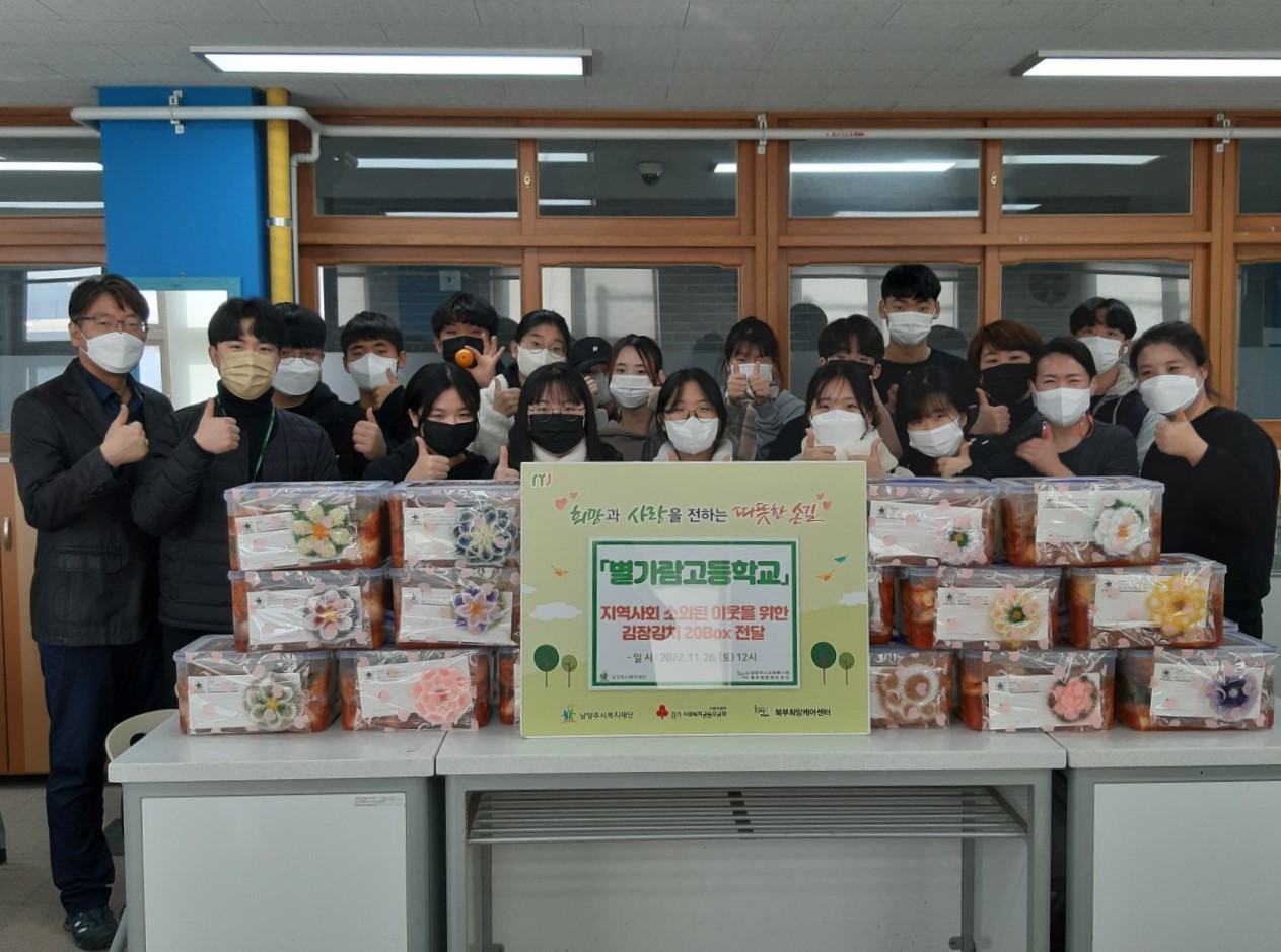 남양주시 별내동 소재 별가람고등학교(교장 김종숙)는 지난 11월 26일 지역사회 소외된 이웃을 위한 김장김치 200kg(20박스)를 남양주시 사회복지관 북부희망케어센터(센터장 전정수)에 전달했다.