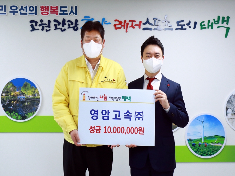 태백 영암고속(주)(회장 박학도)는 지난 16일 태백시청을 방문해 지역의 어려운 이웃을 위해 써 달라며 희망2023나눔캠페인 이웃돕기 성금 1,000만 원을 기탁했다.