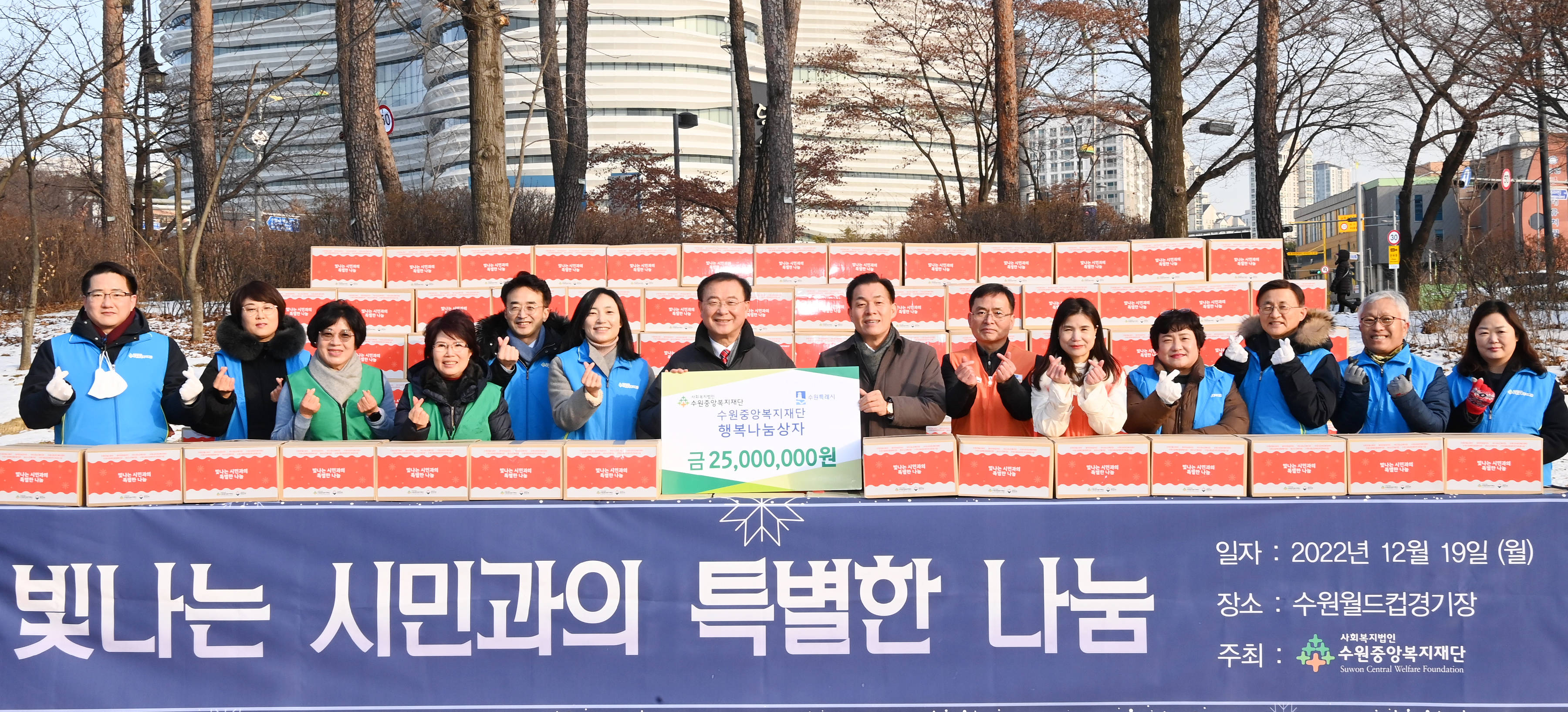고명진 수원중앙복지재단 대표이사는 19일 수원월드컵경기장 주차장에서 이재준 수원특례시장에게 행복나눔상자를 전달했다.