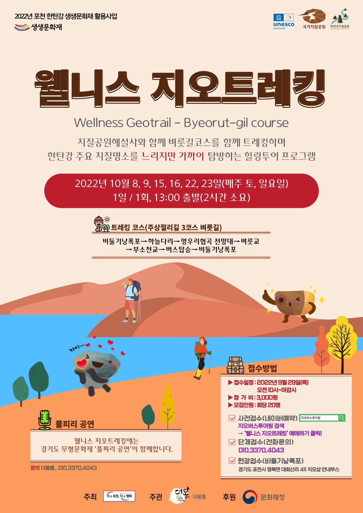 ‘웰니스 지오트레킹’은 문화재청에서 후원하고 포천시에서 주최하며 더봄봄에서 주관하는 ‘포천 한탄강 생생문화재 사업’으로, 한탄강 유네스코 세계지질공원을 느리지만 가까이에서 탐방할 수 있어 참가자들에게 특별한 경험을 선사할 예정이다.