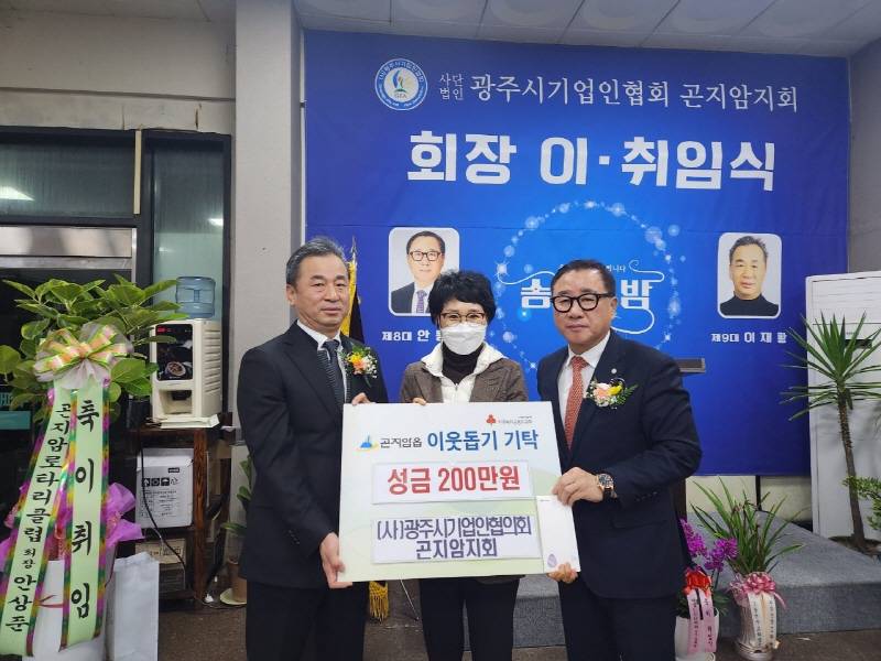 (사)광주시기업인협의회 곤지암지회는 지난 19일 회장 이‧취임식 및 송년의 밤 행사에서 연말 이웃돕기 성금으로 200만원을 광주시 곤지암읍에 기탁했다.