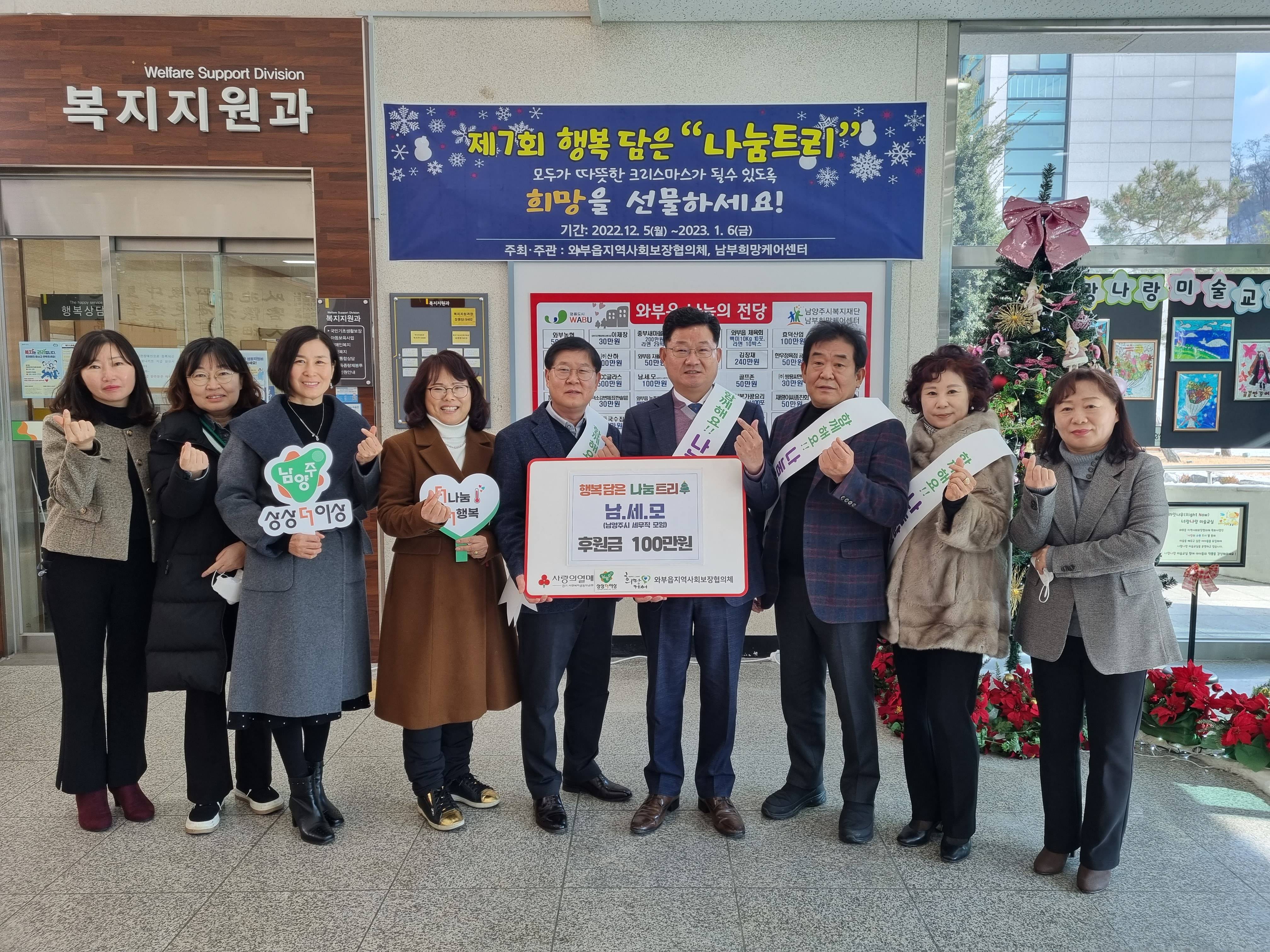 남양주시 와부조안행정복지센터(센터장 이제창)는 지난 22일 남양주시 세무직 공무원 모임(회장 유회근, 이하 남세모)이 와부읍 제7회 나눔트리에 후원금 100만원을 기부했다고 밝혔다.