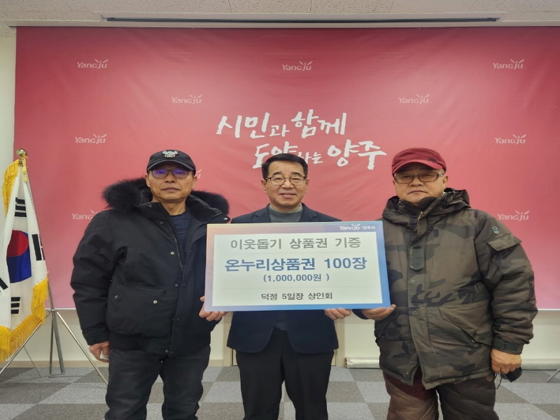 양주시 덕정5일장 시장상인회(회장 심은권)는 지난 27일 회천1동 행정복지센터(동장 이주형)를 방문해 관내 취약계층과 소외이웃들이 따뜻한 연말을 보낼 수 있도록 돕고자 1백만원 상당의 온누리상품권을 전달했다.