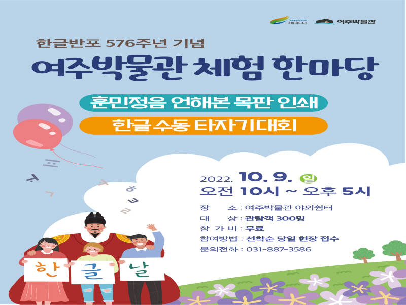 여주시(시장 이충우) 여주박물관에서는 10월 9일(일) 한글반포 576주년을 기념하여 박물관 전시 유물과 연계한 체험행사를 운영한다.