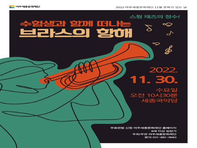 여주세종문화재단은 오는 30일 세종국악당에서 여주시 내 수험생을 위한 특별한 재즈 공연‘브라스의 항해’를 개최한다.