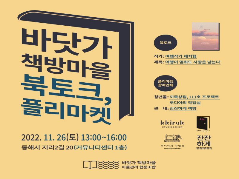 북토크 외에도 동쪽바다 중앙시장에 위치한 청년몰 입주업체인 끼룩상점, 111프로젝트, 루디아의 작업실이 참여하는 플리마켓도 함께 진행되어 행사의 의미를 더했다.